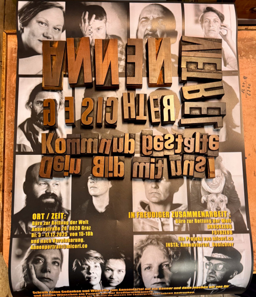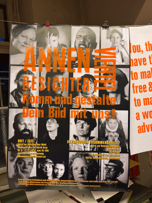 Das Projekt “Annenviertelgesichter” ist eine fotografische Initiative im Grazer Annenviertel. Im “Büro zur Rettung der Welt” in der Annenstraße 20 wurde versucht einen kreativen Raum zu schaffen, der Menschen und ihre Visionen für das Viertel in den Mittelpunkt stellt.